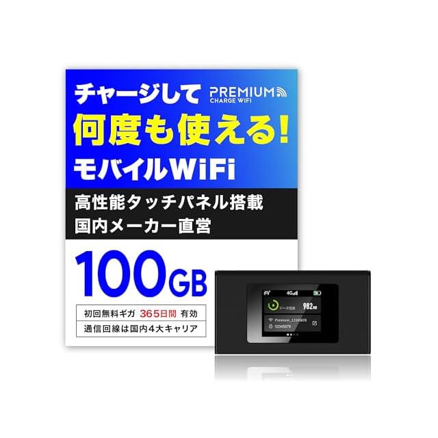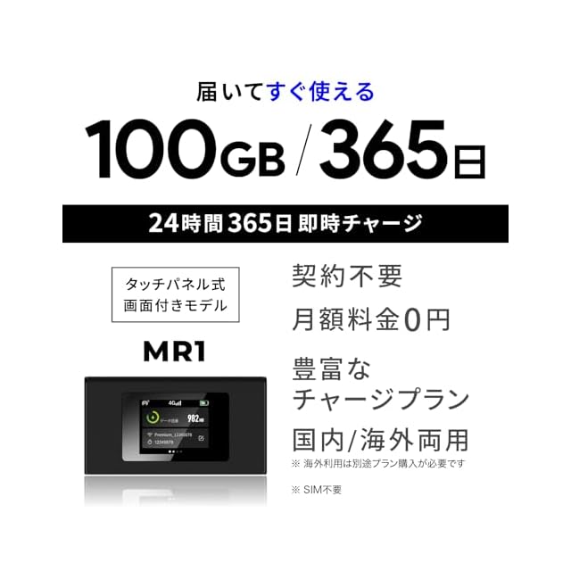 商品名:国内メーカー直営 [MR1] 日本100GB/365日付 ポケット WiFi 【プレミアムチャージWiFi】 ギガ割引クーポン毎月付与 端末買い切り 契約・クレカ不要 利用分だけ都度チャージ 海外利用可能
