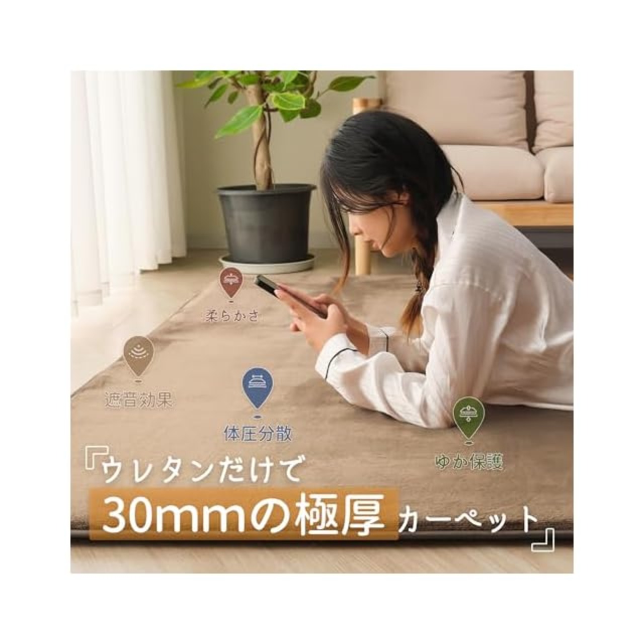 【極厚30mm】30mmの極厚で柔らかいカーペットは、床の存在を感じることなく、どんな姿勢でカーペットの上にいても、長時間座っていても、痛みを感じない!