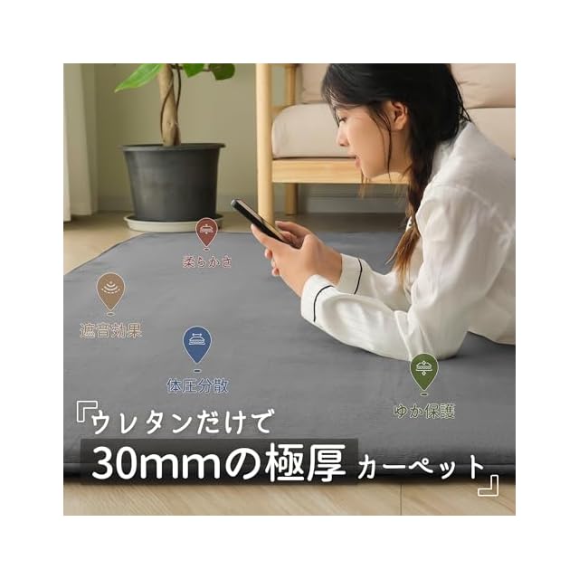 【極厚30mm】30mmの極厚で柔らかいカーペットは、床の存在を感じることなく、どんな姿勢でカーペットの上にいても、長時間座っていても、痛みを感じない!