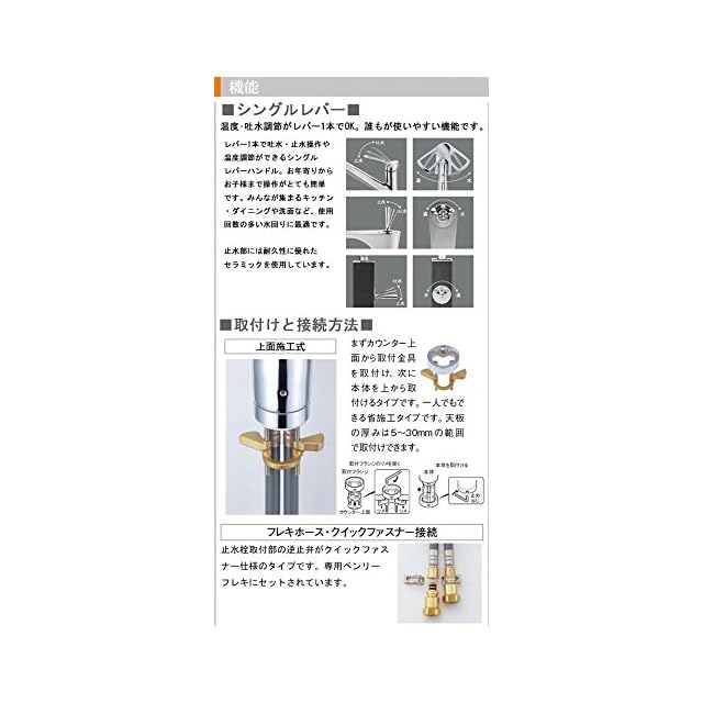 【上面施工式】施工の際に、カウンター下にもぐることなく、上から一人で施工できるタイプです。作業時間を削減できます。フレキホースとクイックファスナーで接続するタイプの商品です。