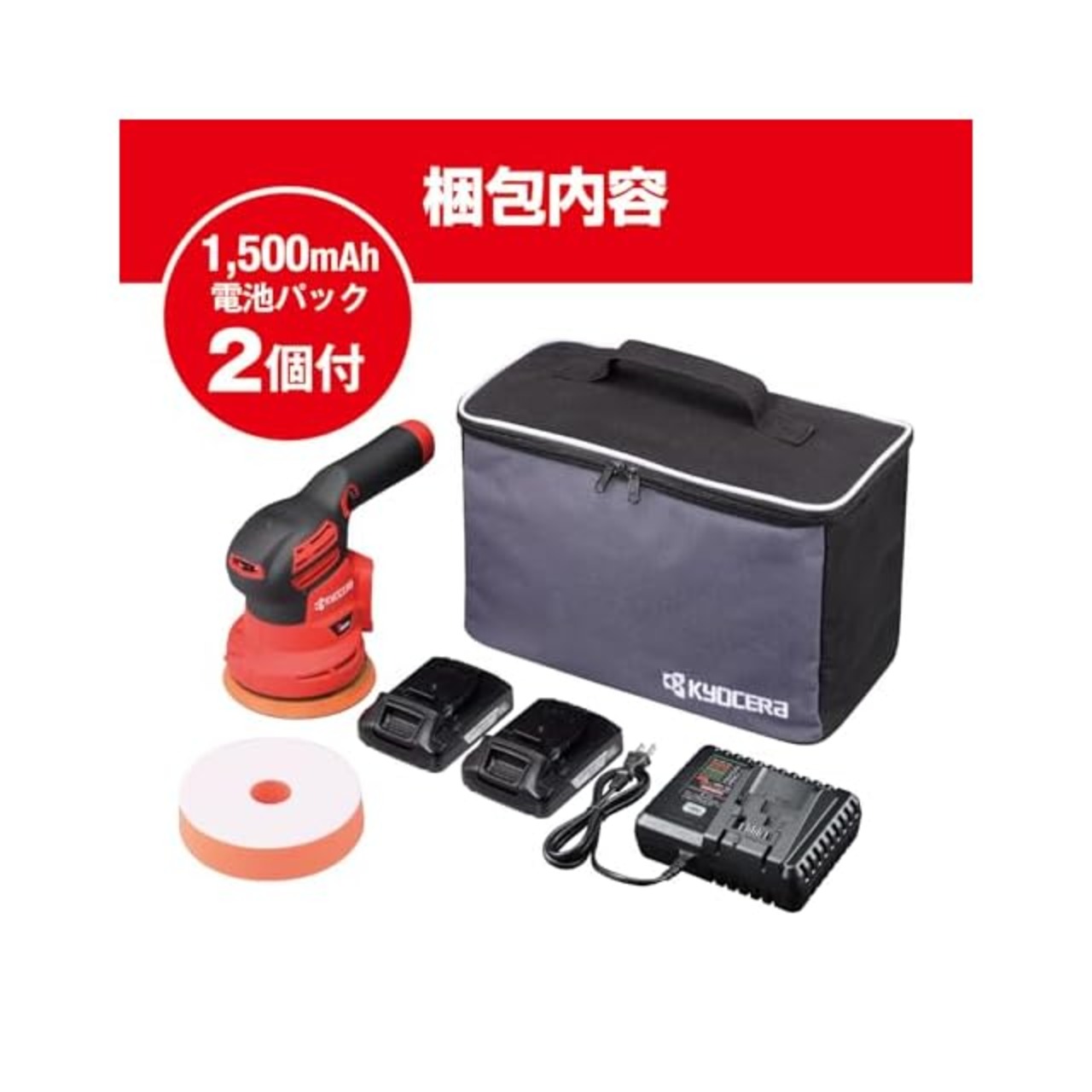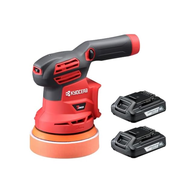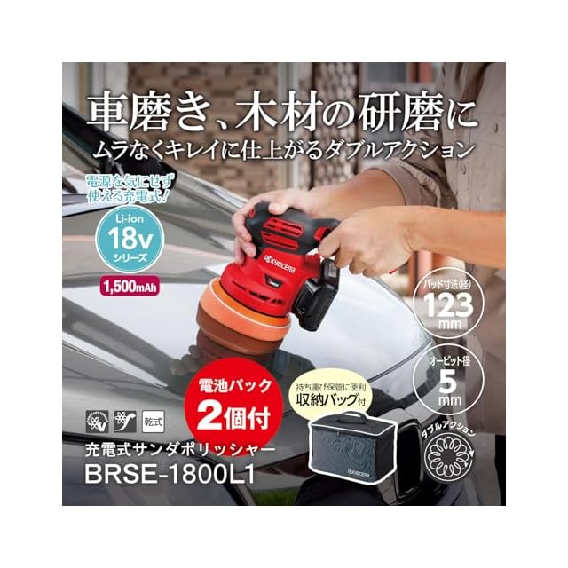 京セラ(Kyocera) 旧リョービ 充電式サンダポリッシャー BRSE-1800L1(バッテリー2個 急速充電セット) 602600C リチウムイオン18V電池2個・急速充電器・収納バック付 【車の塗装面の磨き・艶出し、ヘッドライトのくすみや黄ばみの除去に最適】 オービット径5mmの高い研磨力 スポンジ等を装着したまま自立可能 作業しながらスピード調節可 ソフトスタート付 安全機構搭載