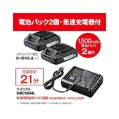 ●電池パック:B-1815LA(リチウムイオン18V・1500mAh)。●充電器:UBC1804L(電源AC100V)。