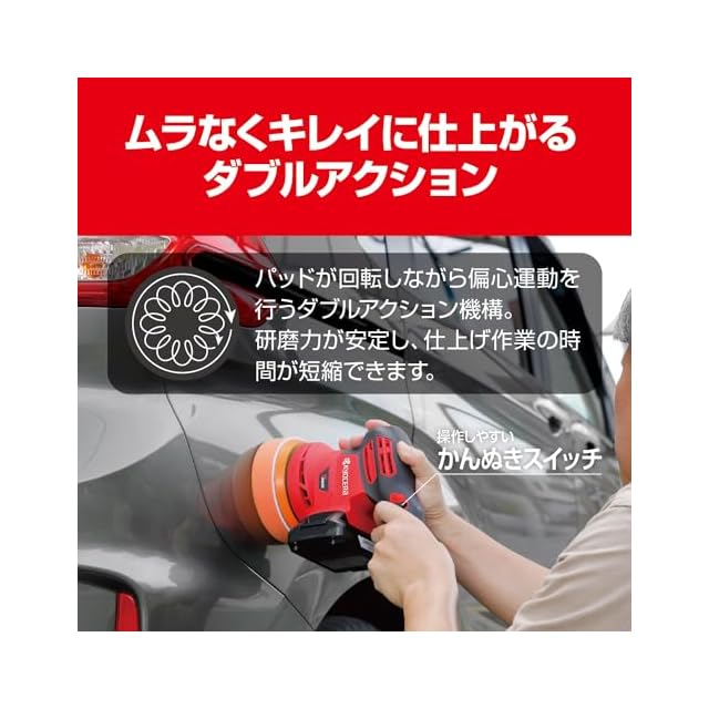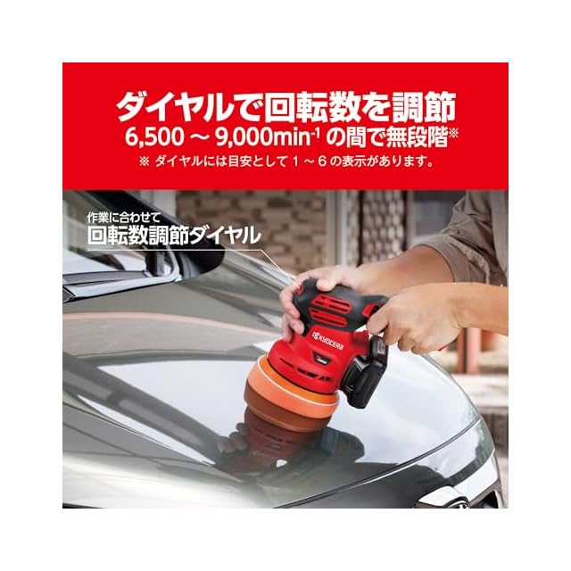 商品名:京セラ(Kyocera) 旧リョービ 充電式サンダポリッシャー BRSE-1800L1(バッテリー2個 急速充電セット) 602600C リチウムイオン18V電池2個・急速充電器・収納バック付 【車の塗装面の磨き・艶出し、ヘッドライトのくすみや黄ばみの除去に最適】 オービット径5mmの高い研磨力 スポンジ等を装着したまま自立可能 作業しながらスピード調節可 ソフトスタート付 安全機構搭載