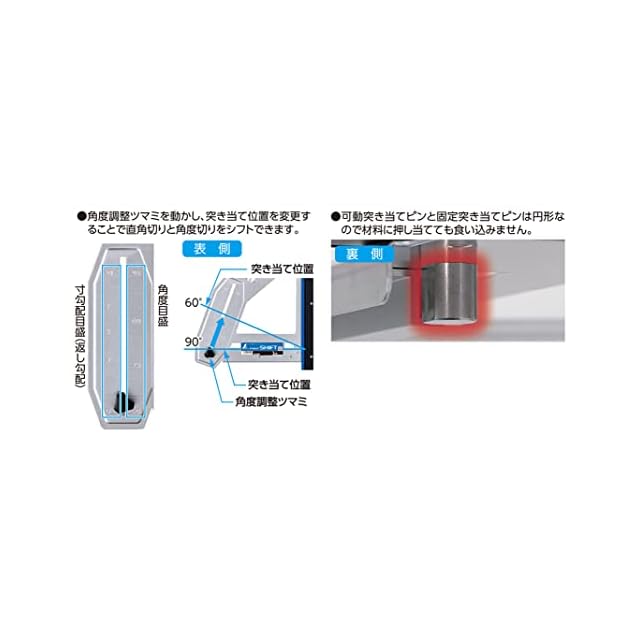 製造国:日本 直角度:100mmにつき0.1mm以下 角度調整範囲:45から90° 寸勾配調整範囲:1から10寸勾配(返し勾配) 材質:本体アルミ、ガイド面・固定突き当てピン・指針ステンレス、大型ハンドル:ABS樹脂、エラストマー樹脂、角度調整ツマミ:フェノール樹脂、真鍮