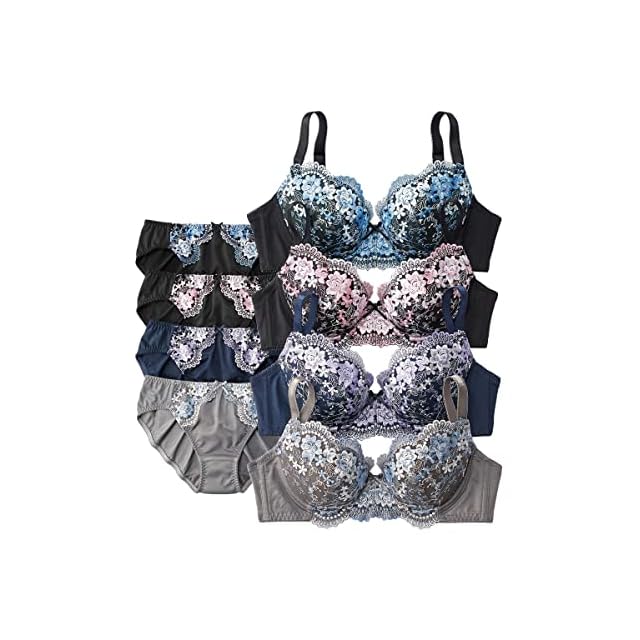 プチプライスでゴージャスな花柄刺しゅうが楽しめるブラジャーショーツ4セット組です。