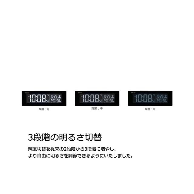表示LED明るさ切替式(3段階)、2099年までのフルオートカレンダー機能、日付/アラーム時刻表示切替式