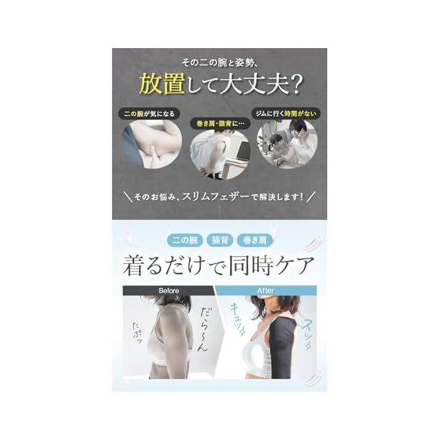 ✨【二の腕着圧インナー Slim Feather (スリムフェザー)】ぷるぷる二の腕、ブス姿勢も『細魅せ』『美姿勢』に! 「根本から美姿勢強制※」 × 「3段階加圧で瞬間引き締め※」 (※ 着用時の効果による)