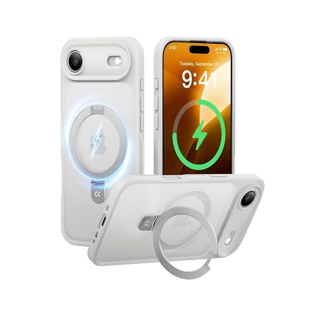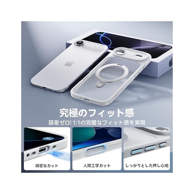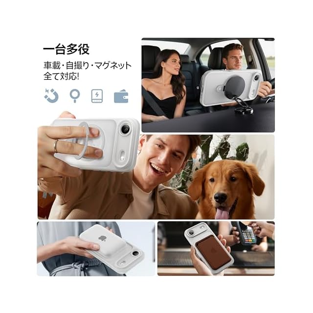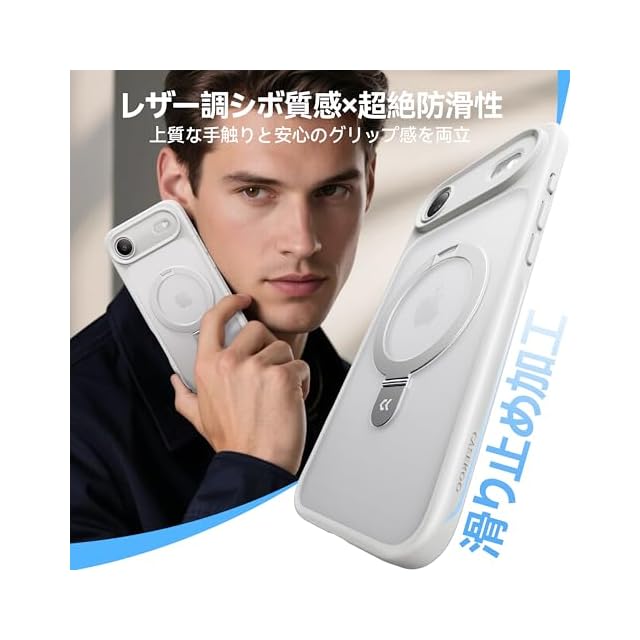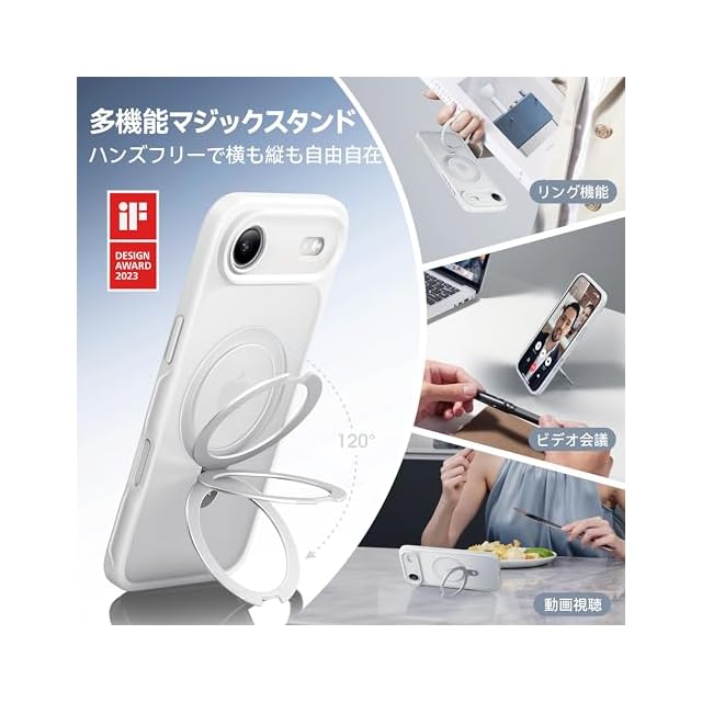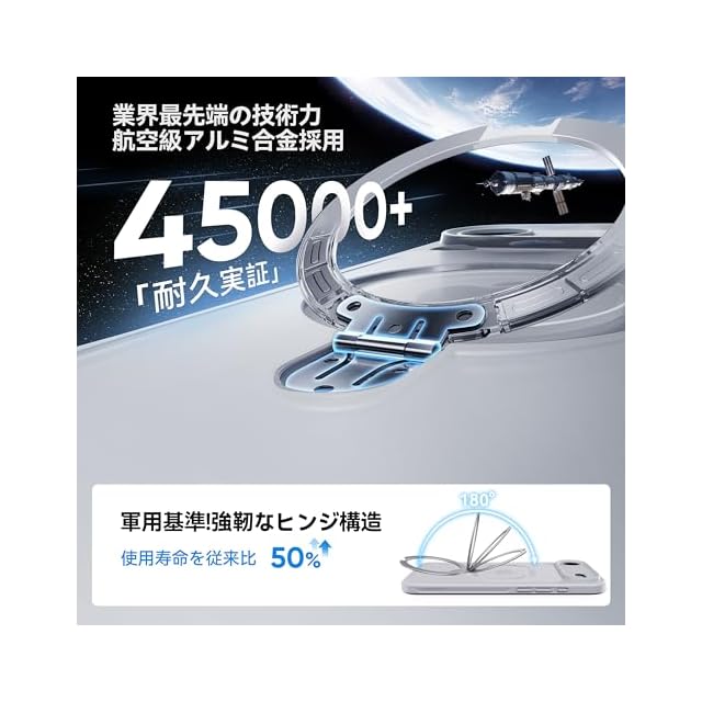 【スゴすぎる!多機能スタンド】MagicStandシリーズのケースは、横向き・縦向き両方で使用可能なスタンド機能を備え、MagSafe対応の無損充電にも対応しています。リング型デザイン、持ち運びも簡単です。スタンド機能は角度調整が自由にできるため、日常のドラマ視聴、動画閲覧、オンライン会議、セルフィー撮影など、さまざまなシーンに対応します。スタンドは強化ヒンジ構造と航空機用アルミ合金素材で設計されており、開閉はスムーズで変形や破損しにくく、45,000回以上の開閉テストでも安定性は変わりません。耐久性は従来のスタンドの約10倍。どんなシーンでもスマホをしっかり支え、日常生活で両手を完全に解放し、快適で便利な使い心地をお楽しみいただけます