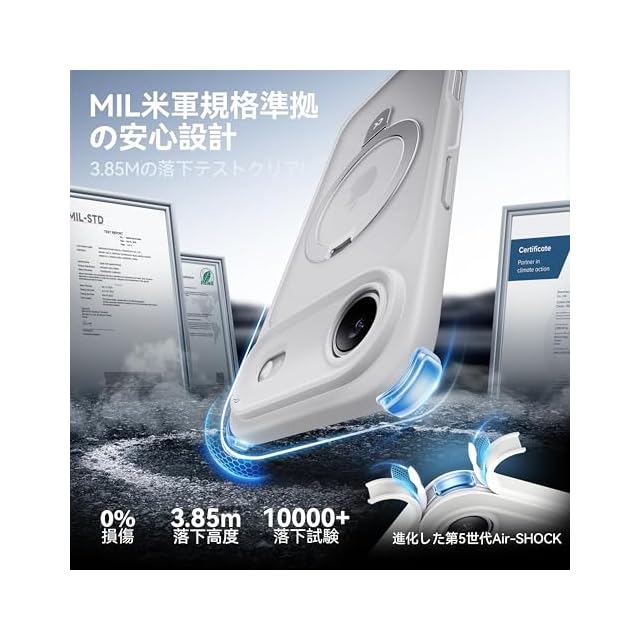 【MIL米軍規格取得・薄型でも強力な防護】この保護ケースは、薄型で軽量ながら、業界最高レベルの耐久性と耐衝撃性を誇ります!CASEKOO独自設計のスマホケースは、常にユーザー目線を重視。高品質な素材(PC+TPC)を使用し、特殊な衝撃吸収技術と三層構造を組み合わせることで、薄型でありながらもしっかりとした保護力を実現しています。ケースの四隅には最新の第5世代AIR-SHOCK技術を採用し、最大3.85メートルの落下衝撃に耐えられます。その衝撃吸収性能は従来のスマホケースの20倍で、落下時でもスマホを安全に守ります。さらに、米国MIL-STD-810G耐衝撃テストを余裕でクリア。軍規格レベルの防護で、スマホの安全性をより一層確保します。ケースの縁は高さを持たせた包み込み設計で、あらゆる角度から大切なスマホを全面的に保護し、どの角度からの衝撃も防ぎます 米軍MIL認証番号:GZMR240702237705|認証機関:CSTC Standards Testing Center | 認証時間:Jul 20, 2024