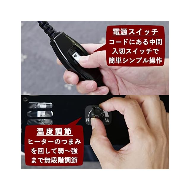 【温度調節】ヒーター温度は、温度調節つまみを回せば弱~強まで無段階での温度調節が可能です。その日の気温や体調に合わせて設定してください。