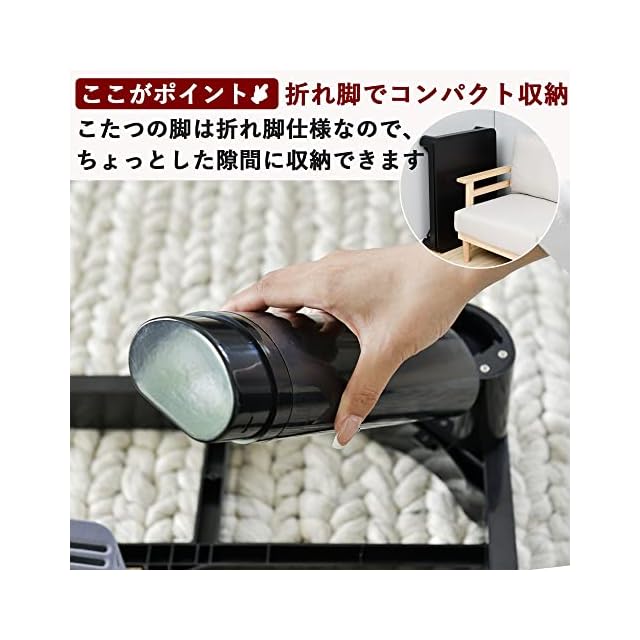 【コンパクト収納】こたつの脚は折りたたんで収納できる折れ脚仕様。収納スペースに困ることなく、家具の隙間などちょっとしたスペースでコンパクトに収納できます。