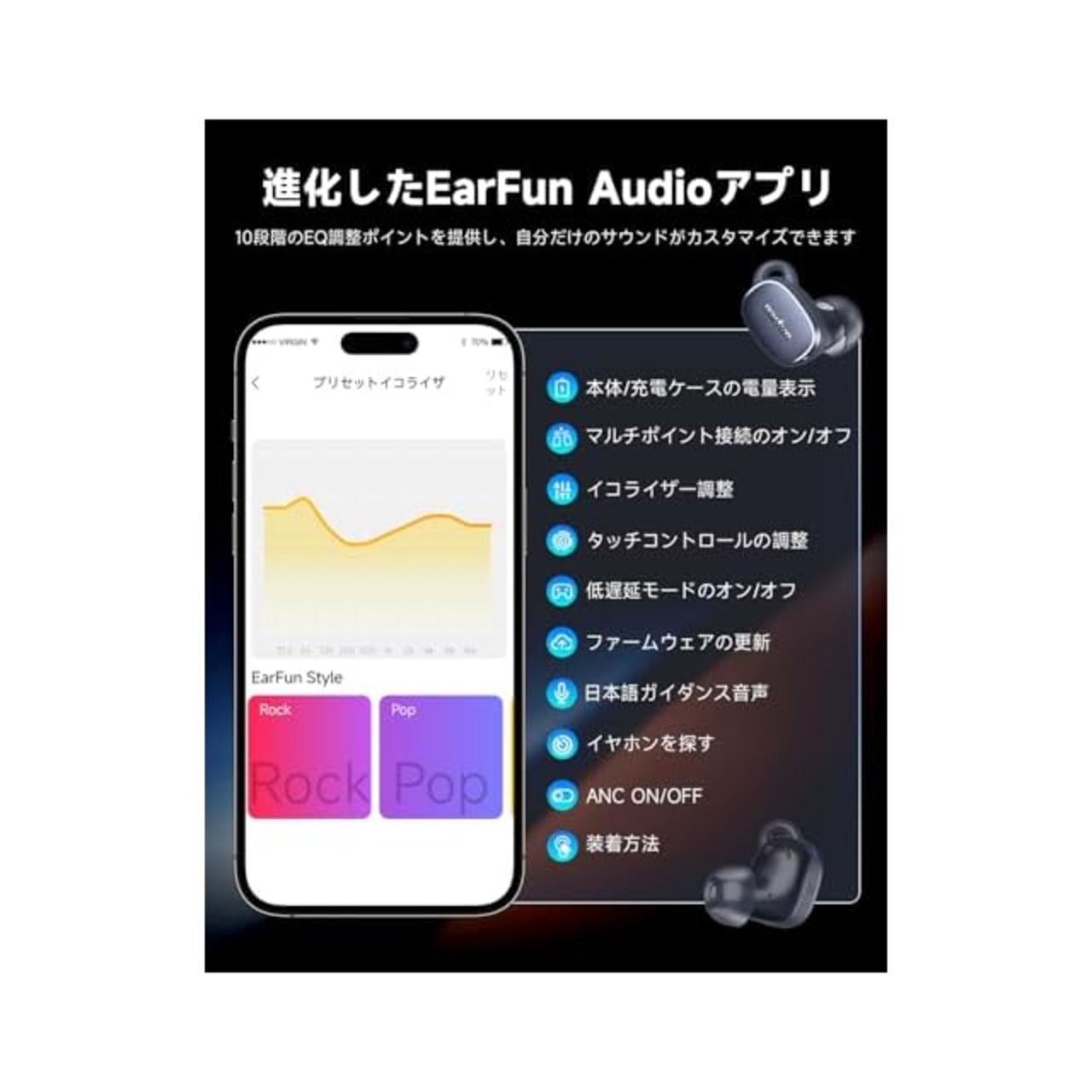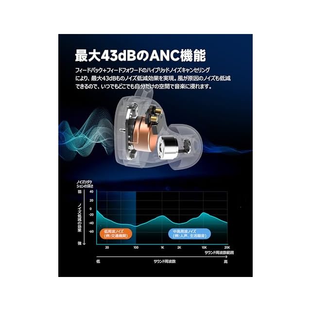 【43dbのディープアクティブノイズキャンセリング、いつでも音楽を静かに楽しむ】フィードフォワード+フィードバックのハイブリッドアクティブノイズキャンセリングにより、最大43dBまでノイズを低減します。騒々しい屋外環境や混雑したバスや電車でも、ノイズキャンセリングモードをワンタッチでオンにして、いつでもどこでも静かな世界を手に入れましょう。周囲の会話を自由に聞きながら音楽を楽しむために環境音モードもサポートされています。✅【イヤーフックデザイン】パッケージには4つの異なるサイズのイヤーチップとイヤーフックが付属しています。最適なノイズキャンセリング効果を得るために、自分に最適なイヤーチップとイヤーフックを選び、耳に密着させてください。