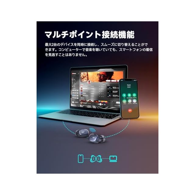 【マルチポイント接続対応、日常のニーズに応える】2つのデバイスをスマートに接続することで、パソコンで映画を見ている最中に、携帯電話がかかってきても、イヤホンで直ちに通話することができます。エンターテイメントと仕事を両立させましょう。【33時間のバッテリー持続時間】イヤホンは1回の充電で7.5時間以上の連続再生が可能であり(ANCオフ)、イヤホンは高速充電に対応しており、10分の充電で2時間の利用が可能です。充電ケースを含めた総合的なバッテリー持続時間は33時間に達し、音楽やゲームを一日中中断することなく楽しむことができます。それに加えて、イヤホンには便利なワイヤレス充電機能も備わっています。