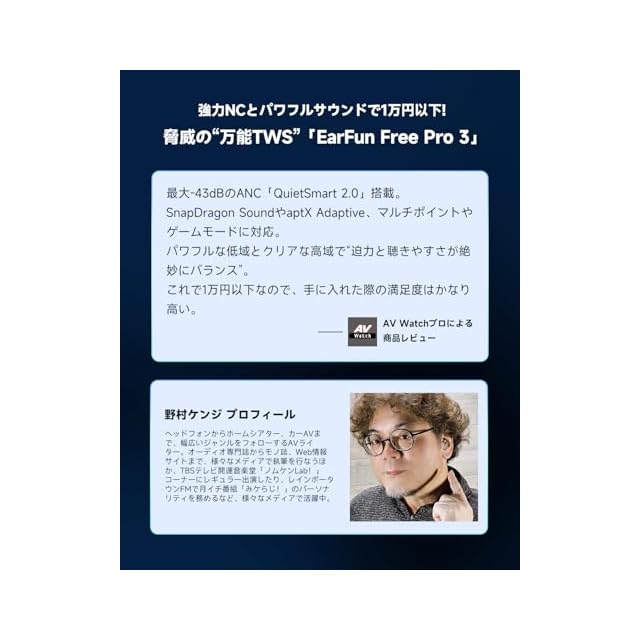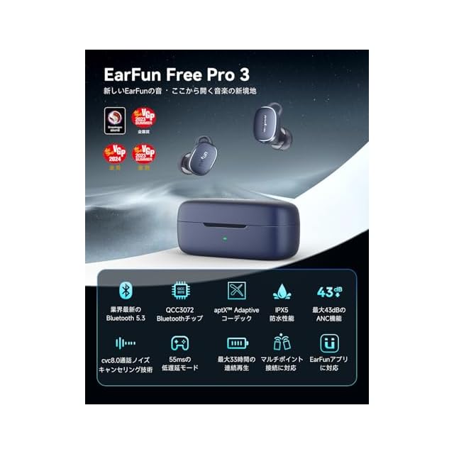 商品名:【VGP 2024金賞】EarFun Free Pro 3 ANC機能ワイヤレスイヤホン bluetooth/Snapdragon Sound対応/QCC3072チップ/aptX adaptive Bluetooth 5.3/ワイヤレス充電/6-マイクcVc8.0通話ノイズリダクション/マルチポイント接続/外音取り込みモード/専用アプリ/最大33時間再生/超軽量設計イヤホン(ネイビーブルー)