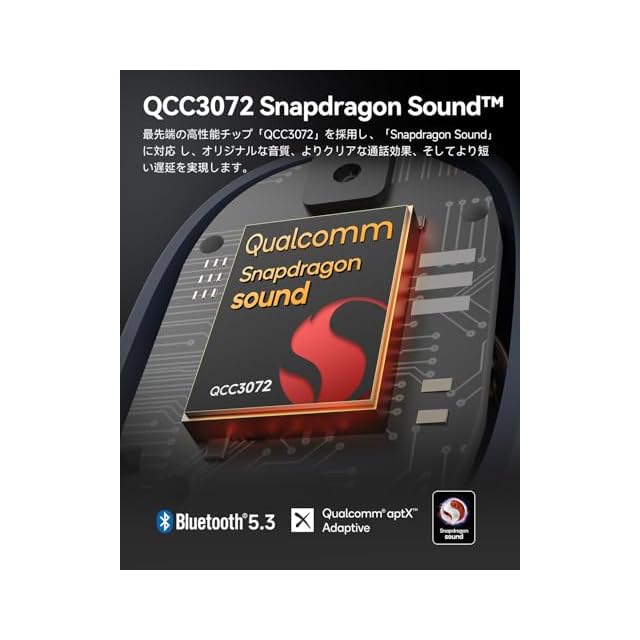 【Snapdragon Soundに対応、ワイヤレスでもハイレゾ音質の時代に】高性能チップ「QCC3072」を採用、最新のSnapdragon Sound音声技術に対応し最大伝送幅が2倍に向上、遅延も約45%低減しています。aptX adaptiveをサポート、最大24bit/96kHzのデータレートを実現しました。注意:Snapdragon Sound互換機器とのペアリングが必要です。
