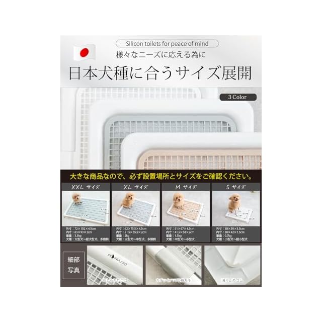 【どんな犬種にも】超小型犬、小型犬、中型犬、大型犬、超大型犬、多頭飼いの方と様々なニーズにお応えできるラインナップです。特にXXLサイズは他にはないサイズ感に仕上がっています。超大型犬用の製品が市場にはあまり出回っていないというお声を頂き、XXLサイズは実現可能な範囲でのサイズへ挑戦致しました。