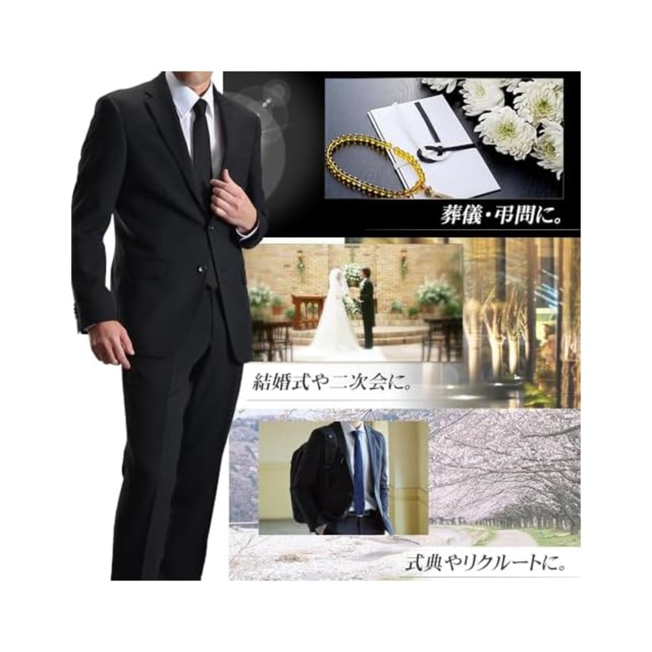 冠婚葬祭、礼服、喪服として結婚式からパーティ、入学式、入社式、リクルートなど様々なビジネスシーンにも対応できる万能ブラックスーツです。