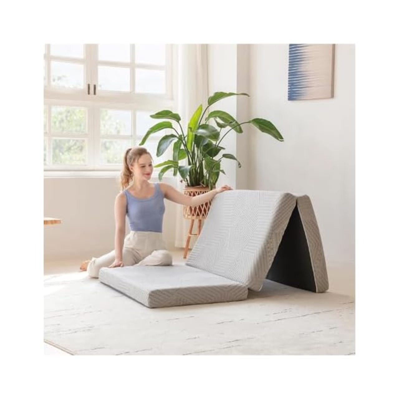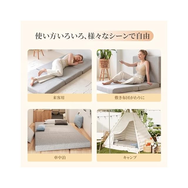 【便利な収納&収納袋付き】このマットレスは三つ折りデザインを採用しており、収納がとても便利です。使用しないときは、家の隅に整然と置いてスペースを節約できます。さらに、マットレスには便利な収納袋が付いているので、持ち運びや保管がより簡単に行えます。三つ折りデザインは、マットレスとしてだけでなく、簡易ソファとしても使えるため、非常に実用性が高いです。小さなスペースにもぴったりで、キャンプや車中泊、来客用布団、二段ベッドなど、さまざまなシーンで活躍します。