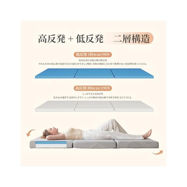 【2層メモリーフォーム構造で理想的な寝心地とサポート】このマットレスは、4cmの低反発ウレタンフォーム(90N)と6cmの高反発ウレタンフォーム(190N)を組み合わせた2層構造で、理想的な寝心地を提供します。低反発層(90N)は、優れた圧力分散性を誇り、体全体を柔らかく包み込みながら、しっかりとフィットします。一方、高反発層(190N)は、体をしっかり支え、優れた弾力性で寝返りや動きをスムーズにサポートします。90Nと190Nの異なる硬度により、季節や体調、寝姿勢に合わせて最適な硬さを選ぶことができ、疲れにくい快適な眠りを実現します。