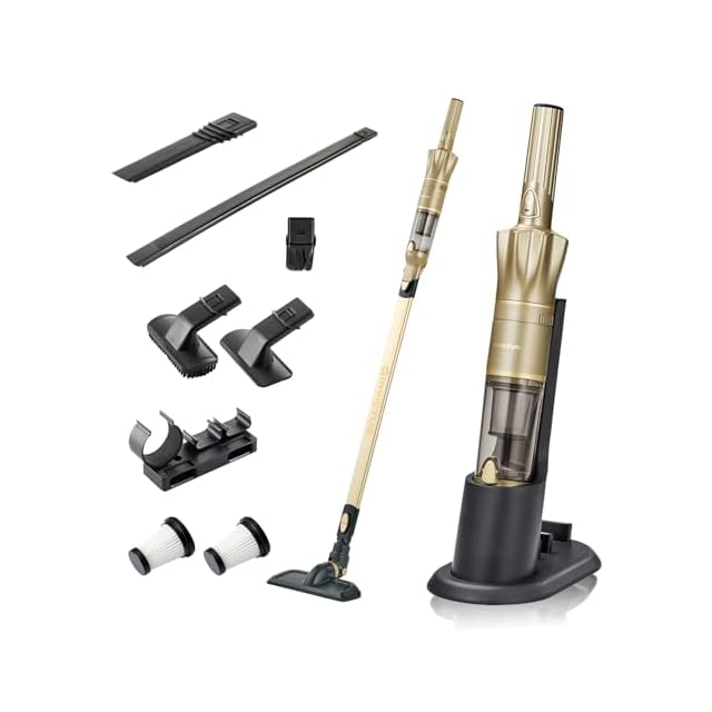 【セット内容】本体、ダストカップ、フリップブラシ、ステンレスフィルター、フィルター、充電アダプター、充電スタンド、取扱説明書、ファブリック用ブラシ、ワイドブラシ、フレキシブルノズル、隙間ノズル、延長パイプ、床用ヘッド、ミニブラシ、交換用紙フィルター×2個、壁掛けホルダー