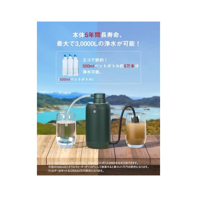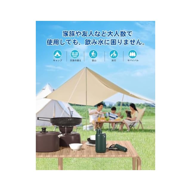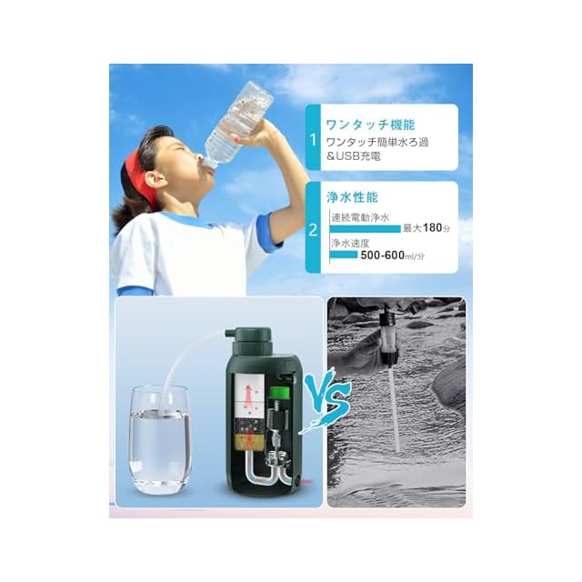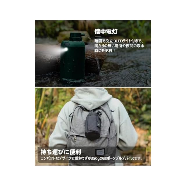 【ワンボタン操作で簡単浄水】浄水ボタンを押すだけで、自然の水を安全で清潔な飲料水に変換。電動式で500mlの浄水を約60秒で生成可能。一度に大量の浄水ができるので、家族や団体など大人数での使用にも最適です。