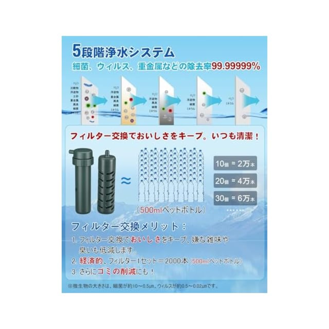 【安心・安全な5段階浄水システム】業界初のデュアル浄水カートリッジを採用し、5段階ろ過システムを搭載した電動式ポータブル浄水器。粒子、赤サビ、大腸菌、コレラ菌などの雑菌や原虫嚢子、沈殿物などを99.9999%除去する性能を国内水質検査機関で実証済み。交換可能な浄水カートリッジにより、いつでも清潔で美味しい水を提供します。