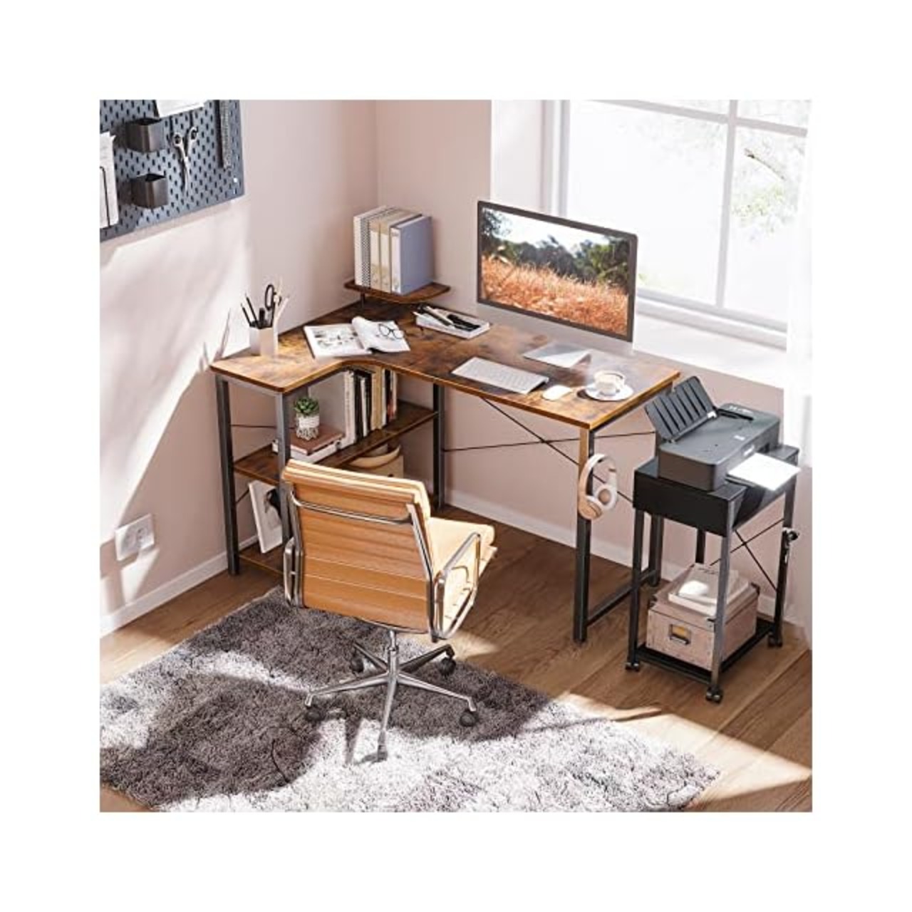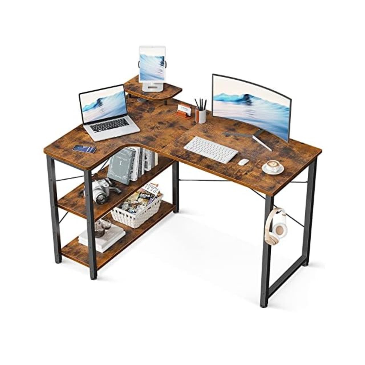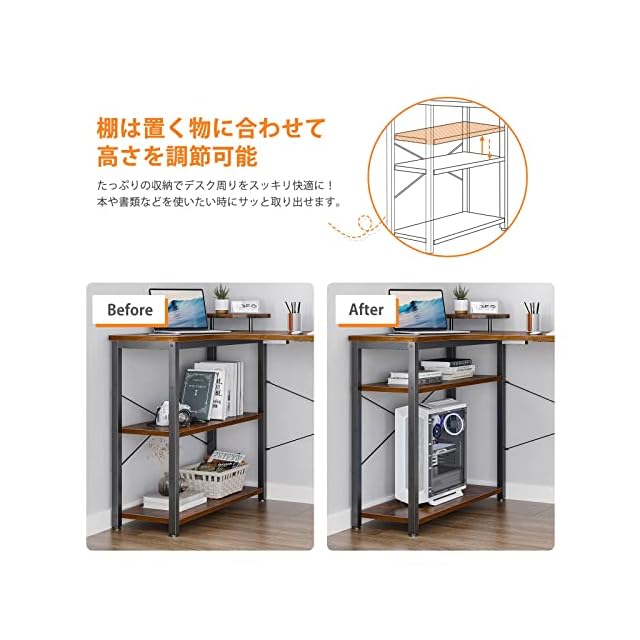 【ラック付きデスク】デスクの足元には一体型のラックが備え、本や書類などを使いたい時にサッと取り出せます。また、L字型のデザインで部屋のコーナーを最大限に活用でき、ご家庭でもオフィスでも、日常の操作に十分なスペースを確保できます。