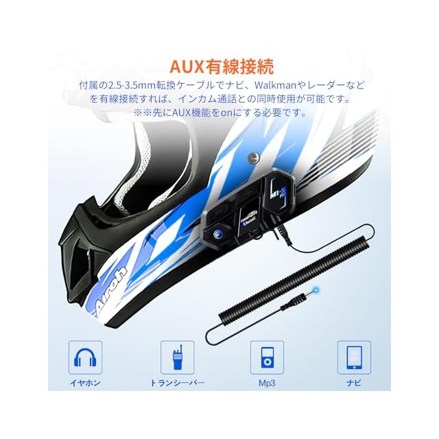 【カッコイイデザイン】ヘルメットによく合うデザインで、そして音量調整及び各種ボタンが使いやすい位置に配置されて、インカムデビューのライダーにとっても、グローブをしたままでも各スイッチの操作も簡単ですが、とても安全です!【AUX有線接続】2.5-3.5mmケーブルでスピード検知器、ナビ、Walkman、ipod、MP3やレーダーなどを有線接続すれば、インカム通話と音楽、ナビの同時使用が可能です。※※先にAUX機能をonにする必要です。【2種類マイク同梱】本体の重さ(約42g)も軽く、付属するマイクもアームマイクとワイヤーマイクが両方同梱していますので、フルフェイスヘルやジェットヘルなど多種多様なヘルメットに取付けが可能です。めちゃくちゃ便利です!