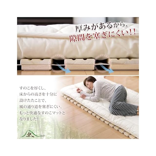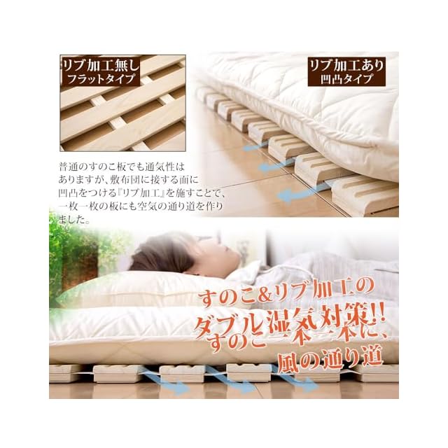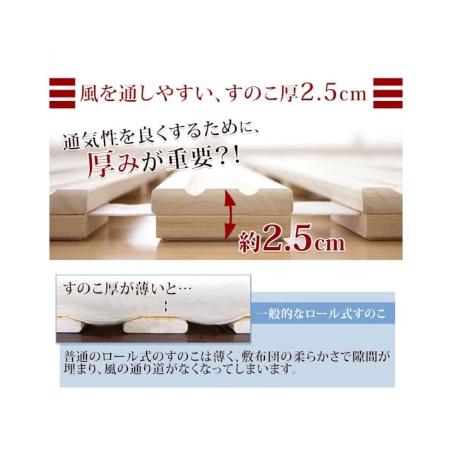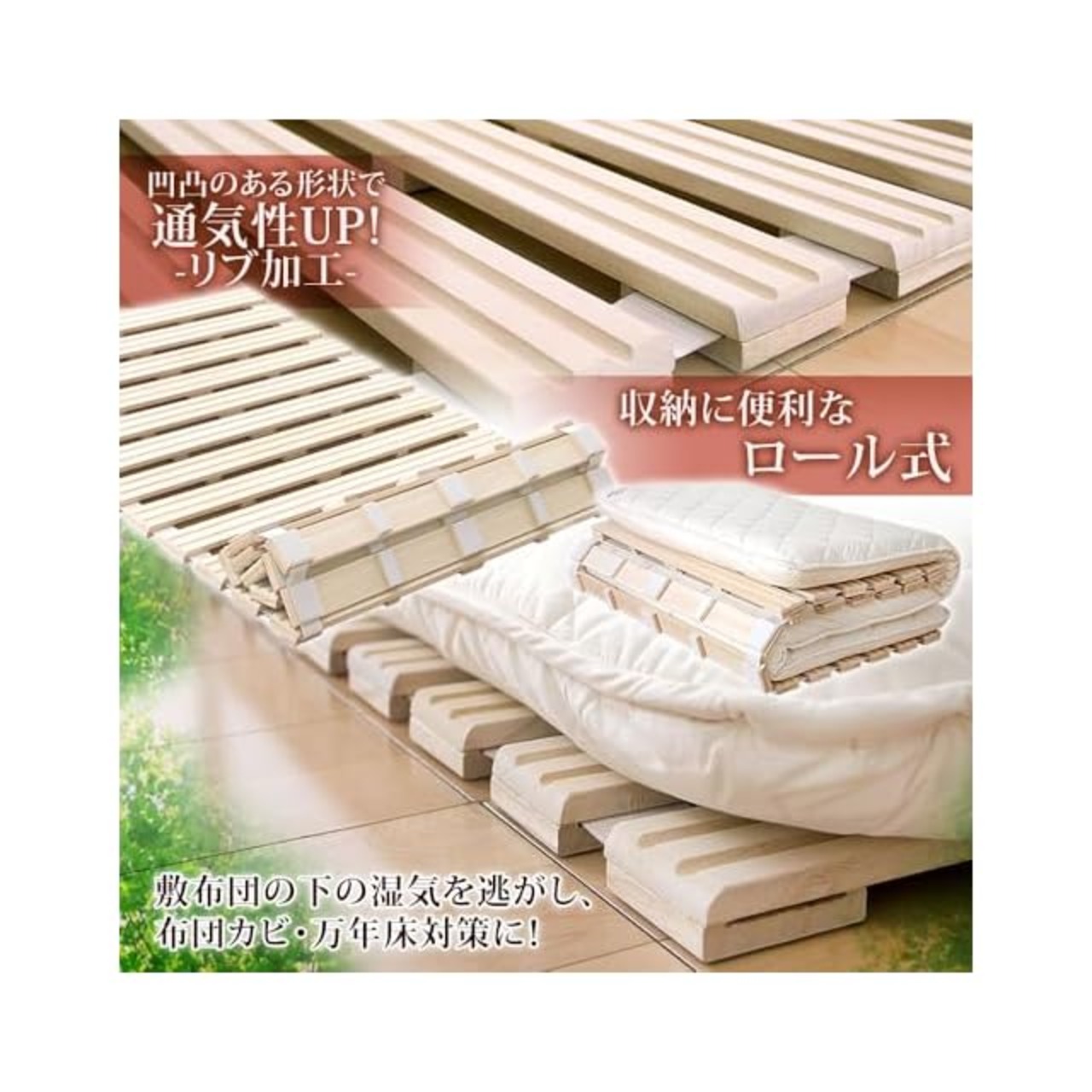 【スタッフのおすすめポイント!】<br><br> ・コンパクトなロール式<br> ・国内の第3者機関にて、性能試験を実施<br> ・布団を湿気・結露から守るすのこマット<br> ・すのこと布バンドの組み合わせで、通気性抜群!<br> ・すのこ板に凹凸を付けた通気性抜群のリブ加工<br> ・風を通しやすい、床からのすのこ厚2.5cm<br> ・お子様にも安心の低ホルムアルデヒド仕様<br> ・折りたたみ固定は簡単マジックテープ式<br> ・キズ防止クッション付き