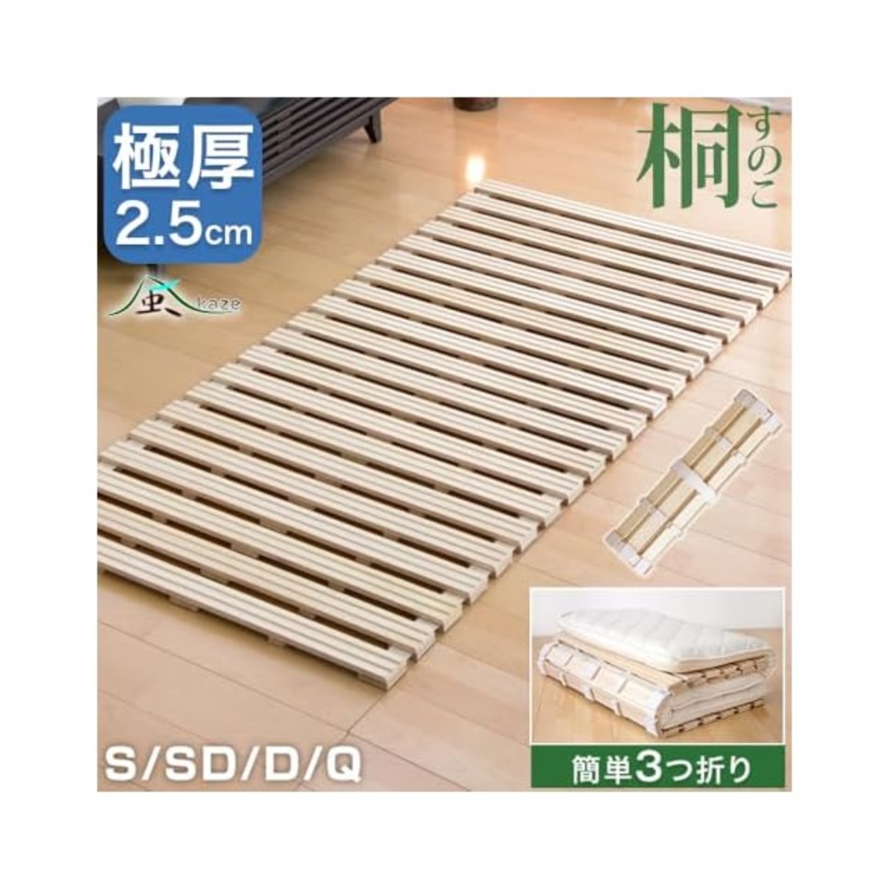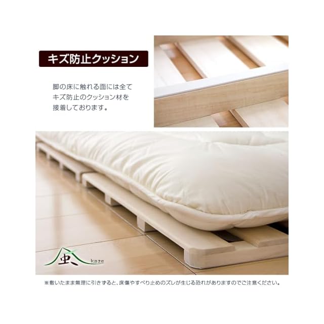【ご使用上の注意】 ※すのこの上に立つ場合はさん木の上に足をかけるなど強度の弱い部分に体重がかからないようにご注意ください。 ※飛び跳ねたり、一点に荷重をかけたりすると割れる恐れがあります。 ※固綿入りの厚手の敷布団や、マットレスでの使用を奨励しています。 ※1カ所に力が加わるようなご使用で破損した場合、取扱い説明書の注意をお守り頂いていない場合などは、返品・交換の対象外となりますので、予めご了承ください。