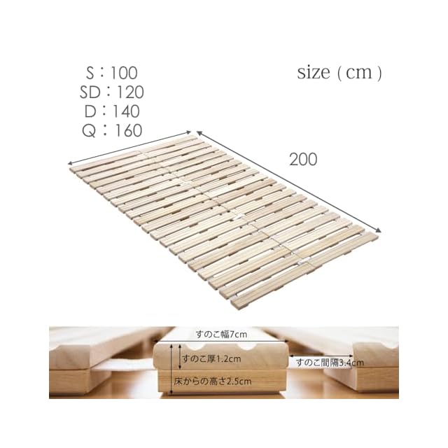 【サイズ】幅100×奥行き200×高さ2.5cm / すのこ厚:2.5cm(1.2+1.3cm) / すのこ幅:7cm / すのこ間隔:3.4cm