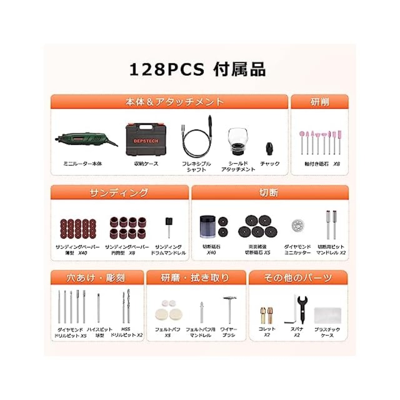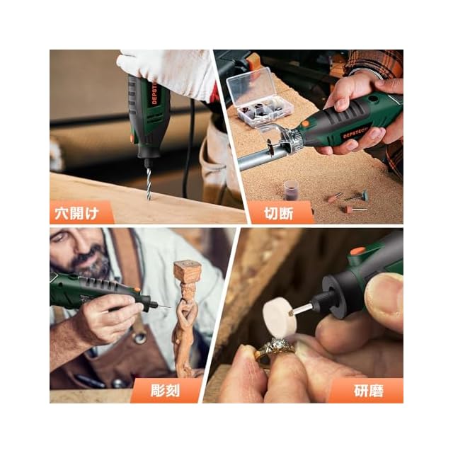 商品名:DEPSTECH ミニルーター 40000RPM高速回転 128点アクセサリー 電動リューター 6段変速 ハンドルーター シールドアタッチメント フレキシブルシャフト 木工/彫刻/穴あけ/研磨/切断/切削/つや出し/マニキュア/汚れ落とし 12ケ月付 収納ケース付