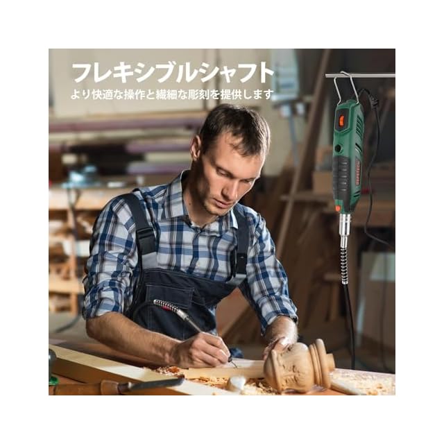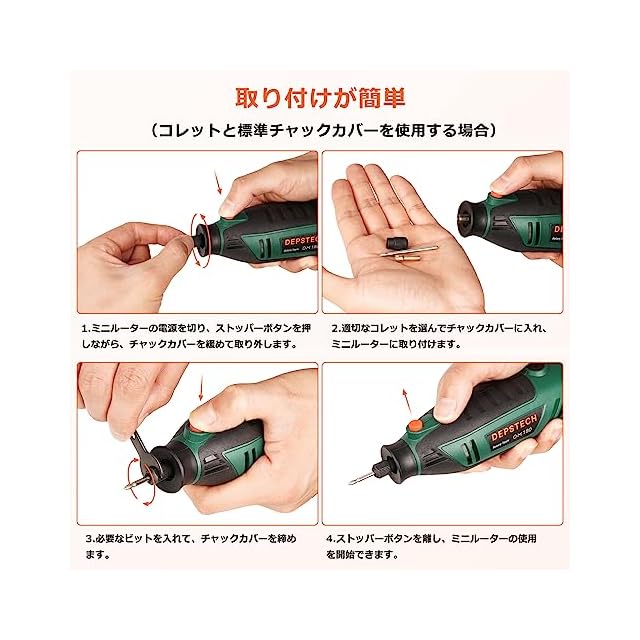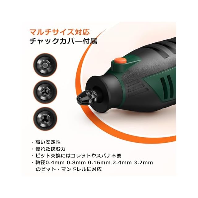 【ユニバーサルキーレスチャック】このパワフルな電動リューターは、ユニバーサルキーレス三つ爪チャックを備えています。これにより、レンチやコレットを使わずに素早く簡単に電動リューターにアクセサリーを交換することができ、.4mm~3.2mmのシャンクのアクセサリーを受け入れることができます。他の製品よりも広く互換性があります。