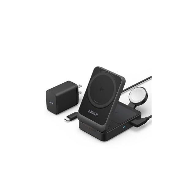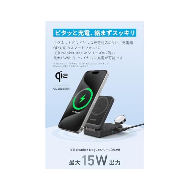 商品名:Anker MagGo Wireless Charging Station (Foldable 3-in-1) Qi2対応 マグネット式 3-in-1 ワイヤレス充電ステーション/ワイヤレス出力/Apple Watchホルダー付 iPhone MagSafe対応 iPhone 17 / 17 Pro / 17 Pro Max / 16 / 15 / 14 / 13 ブラック