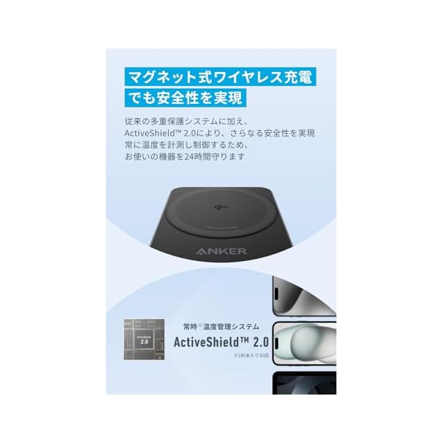 マグネット式ワイヤレス充電でも安全性を実現:従来の多重保護システムに加え、 Active Shield2.0により、さらなる安全性を実現 常に温度を計測し制御するため、お使いの機器を24時間守ります。