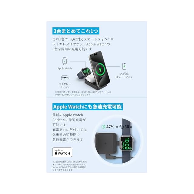 3台まとめてこれ1つ:これ1台で、Qi2対応スマートフォンやワイヤレスイヤホン、Apple Watchの3台を同時に充電可能です。