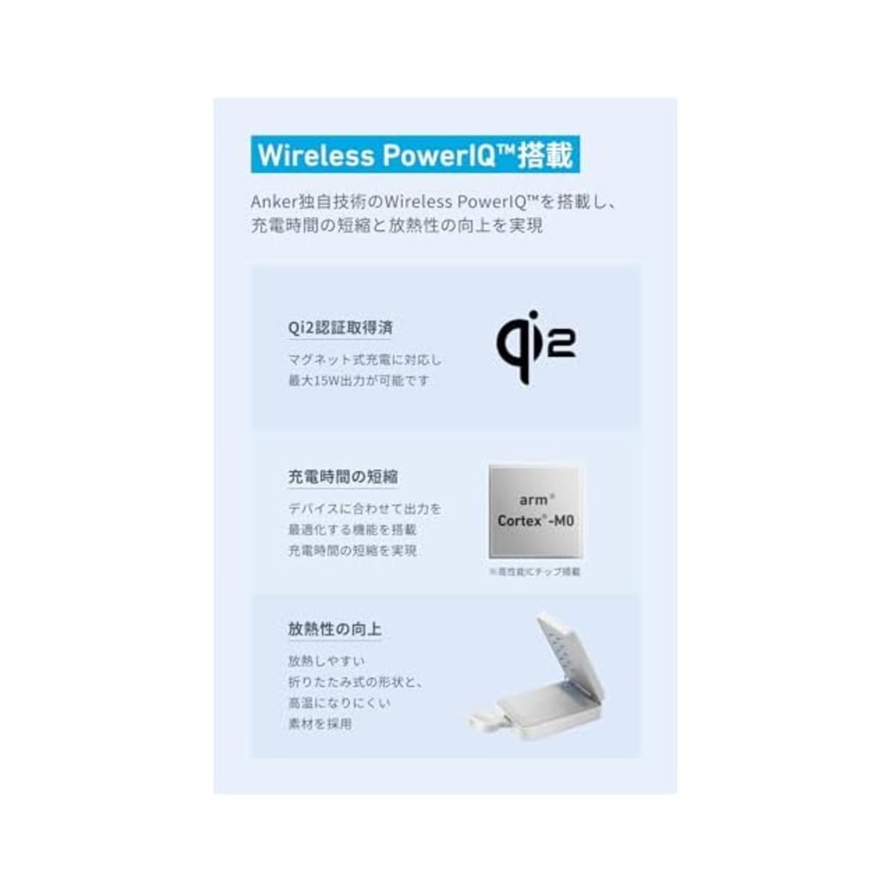 Wireless PowerIQ搭載:Anker独自のWireless PowerIQを搭載し、 充電時間の短縮と放熱性の向上を実現しました。