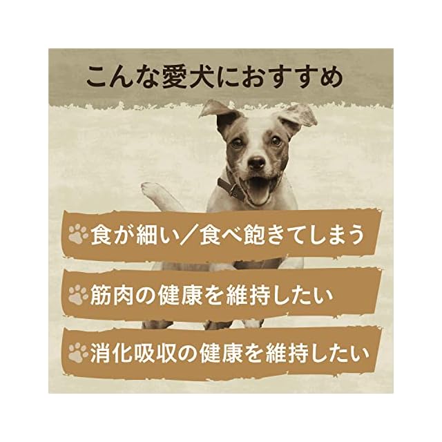 穀物は原材料として使わず、消化性に優れた高品質なヒヨコマメやポテトを使用。穀物の消化が苦手な愛犬の健康維持と消化吸収に配慮しています。