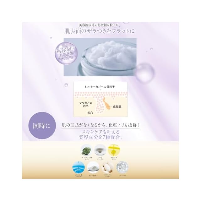 シルキーカバーオイルブロックは、肌トラブルや年齢により開いた毛穴や小じわに入り込み、肌をフラットに整える化粧下地です。<br /> それはジェルでもクリームでもないフワフワのテクスチャー。<br /> キチンキトサンをはじめとした微粒子成分が肌の凹凸にピタッと密着するため、厚塗り感がなくカバーした部分はまるで本当の自分の肌のように馴染み、一枚ベールをかけたようなすっぴん風シルク肌が体感できます。<br /> ■内容量<br /> 28g×1<br /> ■全成分<br /> ジメチコン、シクロペンタシロキサン、(ジメチコン/ビニルジメチコン)クロスポリマー、アクリレーツクロスポリマー、(ビニルジメチコン/メチコンシルセスキオキサン)クロスポリマー、トリメチルシロキシケイ酸、イソノナン酸イソノニル、ジメチルシリル化シリカ、セリシン、アーチチョーク葉エキス、加水分解コラーゲン、プラセンタエキス、ヒアルロン酸Na、テトラヘキシルデカン酸アスコルビル、ポリクオタニウム-51、エタノール、水、ヒドロキシプロピルキトサン、フェノキシエタノール、カルボキシメチルキチン、BG<br />
