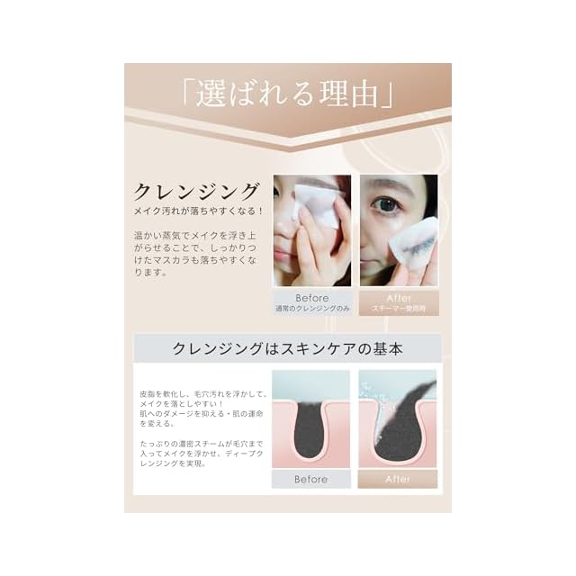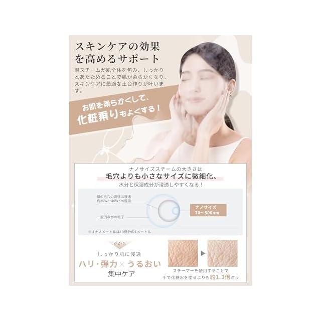❤【微粒化技術/ワイド濃密スチーム】ナノは1mmの10億分の1の細かい粒子。普通のスチームと比べて格段にキメが細かいので肌への浸透力も高い!瞬時にナノ化された水分子がお肌の奥にまで届く、毛穴を開くことで詰まった角栓や汚れを落とし、洗浄効果を高め基礎化粧品の浸透率をアップさせてくれる美顔スチーマーです。