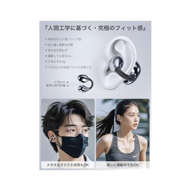 【装着感ゼロ!・動いても外れにくい】「SoundClip」OWSイヤホンはイヤカフ式にしております。C型ブリッジ部分に採用したニッケルチタン製形状記憶合金ワイヤーは、耐久性がありつつも高い弾力性を備えるため、さまざまな耳型にぴったりフィットします。また、イヤホンの重さは片耳わずか5.3gで、より軽やかでしっかりとしたフィット感を実現しました。テレワークで1日中装着していても、激しい運動時に付けっぱなしにしていても、自然なフィット感を保っております。「SoundClip」イヤホンはあなたの体の一部になることでしょう。
