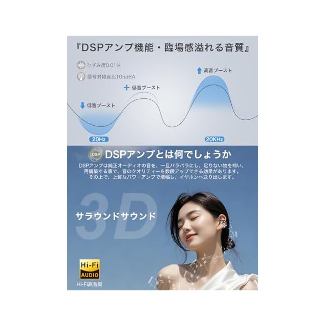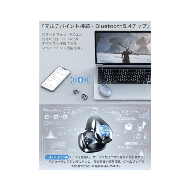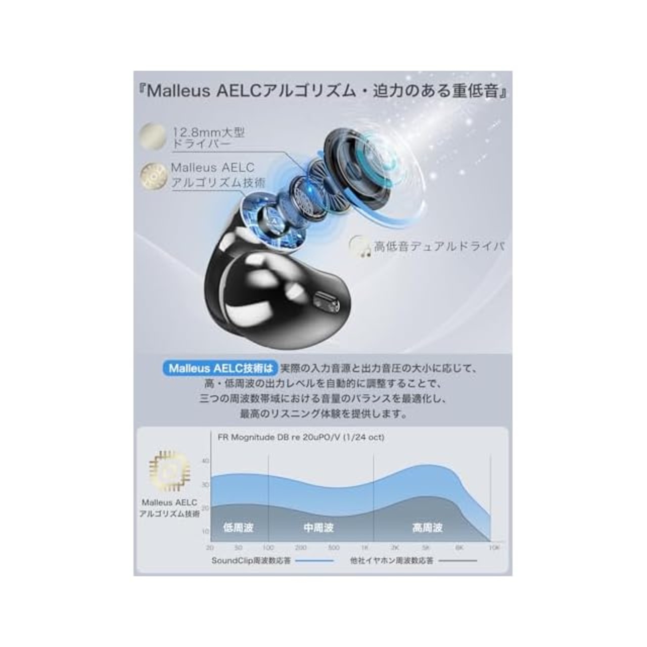 【Malleus AELCアルゴリズム技術・細部まで聴こえる音質】「SoundClip」OWSイヤホンが採用したMalleus AELCアルゴリズム技術は、実際の入力音源と出力音圧の大小に応じて、高・低周波の出力レベルを自動的に調整することで、三つの周波数帯域における音量のバランスを最適化し、最高のリスニング体験を提供します。「SoundClip」OWSイヤホンは12.8mm超大型ドライバーを搭載し、クリアな高音から自然に響く低音まで、あらゆる音域で豊かな音色を楽しめます。まるでライブ会場で聴いているような圧倒的な存在感のあるオーディオ体験を生み出します。膜の張ったようなこもりを感じることなく、没入感のあるHi-Fiサウンドをそのまま楽しめます。