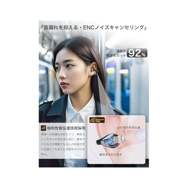 【最新サウンドディレクション技術・音漏れ防止設計】「SoundClip」OWSイヤホンは革新的な音の指向性技術を採用しました。最適な音の伝わり方を追求し、内部構造とアルゴリズムで方向を制御、外耳道と鼓膜に直接音を届けます。抜けが良く圧迫感を感じない、立体的で臨場感のあるサウンドを実現しました。後方スピーカーにより筐体内の空気圧の調節やサウンドキャビティで、音漏れを効果的に抑制しています。オープンイヤーながらユーザーのプライバシーを守り、パーソナル空間を作り出します