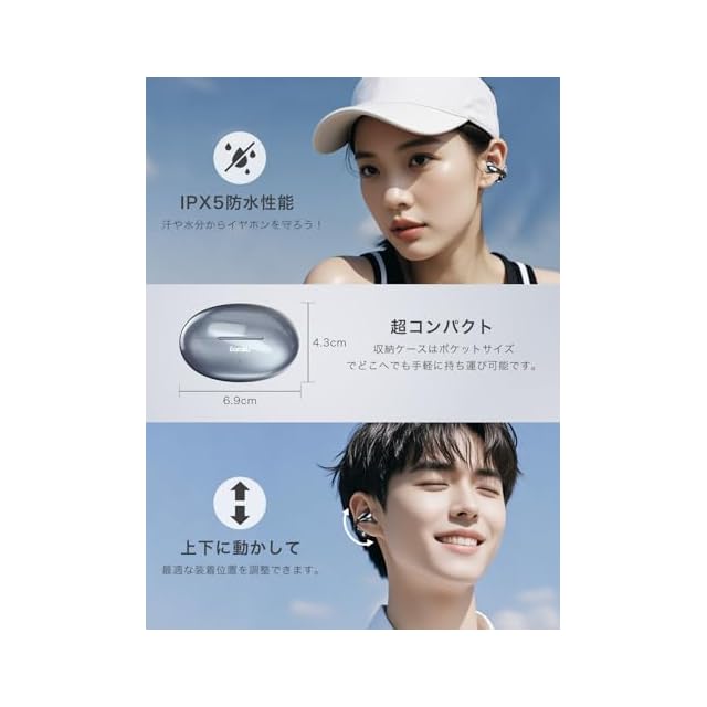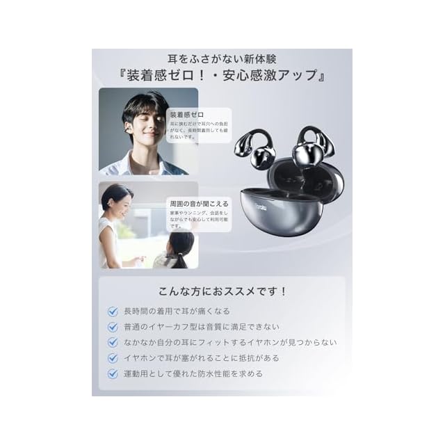 【IPX5防水仕様・スポーツシーンでも活躍】IPX5の防水機能を備えた「SoundClip」OWSイヤホンは、日常的な雨や汗に対して耐性を持ちます。これにより、ランニングやアウトドアでの活動など、激しい運動や湿度の高い環境でも安心して使用することができます。それに、湿った布での拭き取りなど、簡単なお手入れも可能です。*運動後に多量の汗をかいた際は、イヤホン表面の汗などを拭き取ってから、充電ケースに戻してください。
