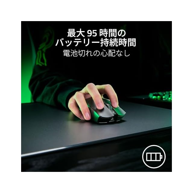 【Razer 8,000 Hz HyperPolling 技術】 Razer HyperPolling に Razer HyperSpeed の超スムーズな接続を組み合わせることにより、最大 8000 Hz のポーリングレートを実現。完璧なワイヤレスパフォーマンスを発揮します。