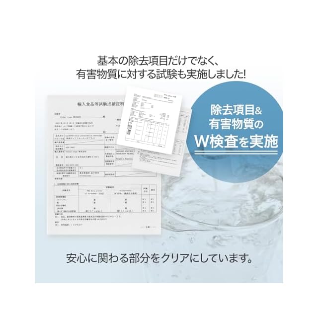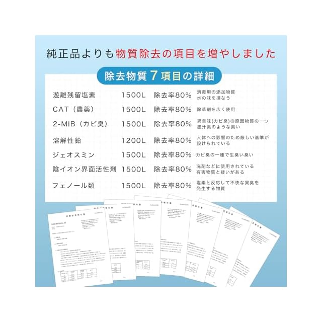 浄水能力: 7物質除去。(遊離残留塩素、CAT、2-MIBカビ臭、溶解性鉛、フェノール類、ジェオスミン、陰イオン界面活性剤) ろ材の種類: 中空糸膜、イオン交換繊維、活性炭、不織布。(一部パッケージには除去項目の反映、記載がございませんが、浄水能力は間違いなく試験にて7項目確認済みですのでご安心下さい。) * カートリッジの取替時期の目安: 1日に10Lご使用の場合、約4ヶ月/個。×3個で合計1年分です。(取替時期の目安は、ご使用の水量・水質・水圧などにより異なります。)