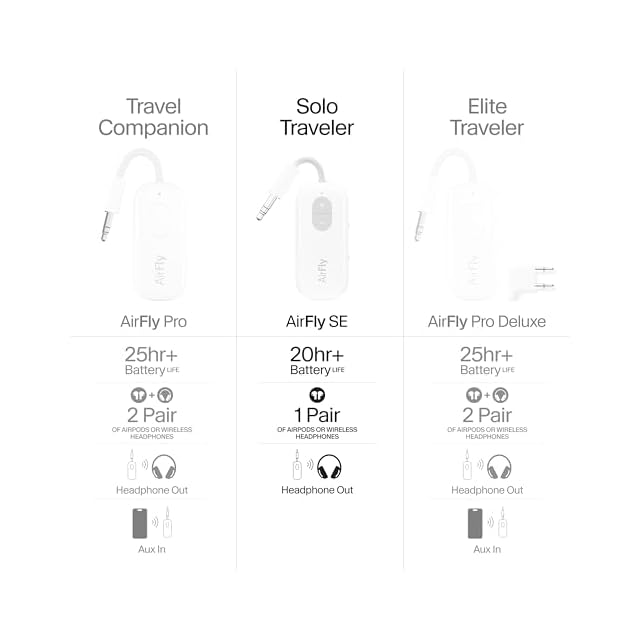 AirFlyは、飛行機内やトレーニングジムのようにBluetooth未対応の機器がある場所で、ワイヤレスイヤホンやワイヤレスヘッドホンを使用できるようにするためのBluetoothトランスミッターです。このAirFlyを3.5mmイヤホンジャックに差し込むことで、機内の映画やジムのテレビの音をワイヤレスイヤホンで聴くことができます。AirFlyは最長20時間以上もバッテリーが持つので、どんなに長いフライトでも使い続けることができます。付属品はUSB充電ケーブルとトラベルポーチが含まれています。また、本製品には高品質で遅延の少ないaptX Low Latency技術を採用しています。