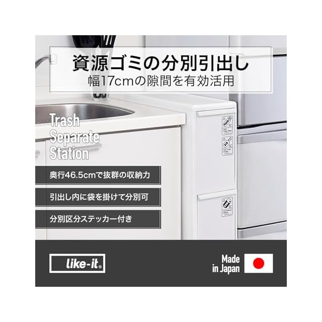 ライクイット (like-it) 分別ゴミ箱 3段 キッチン 隙間 スリム 約幅17×奥行46.5×高さ88.1cm 42L 日本製 分別引出し ステーション スリム3段 ホワイト BS-3