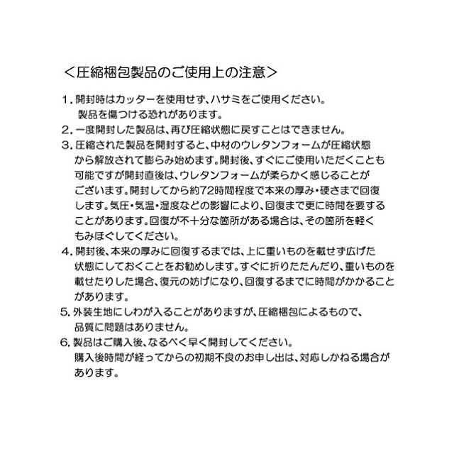 コンパクトな圧縮パックでお届けします。お部屋の中までスムーズに運ぶことができて便利です。※開封から使えるようになるまで半日~1日ほどかかる場合がございます。お時間に余裕をもって復元してください。(本来の厚みまで戻るのは72時間ほどかかります)
