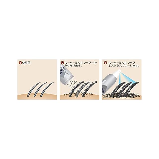 スーパーミリオンヘアーは 増毛パウダー(植物系抗菌繊維)が静電気で付着して髪を太く見せることにより、 頭頂部・後頭部・分け目・つむじ・生え際の薄毛をカバーし、 自然にボリュームアップしたように見せる商品です。 雨、風、汗からスーパーミリオンヘアーを取れにくくするため、 スーパーミリオンヘアミストまたはスプレーをセットでご使用下さい。 乾いた後、くしやブラシは使用しないでください。 洗髪すれば簡単に落とせます。地肌や髪に害はなく、養毛剤との併用もできます。 男女兼用 内容量:30g 原産国:日本 全成分:植物系抗菌繊維 カラー:ブラック
